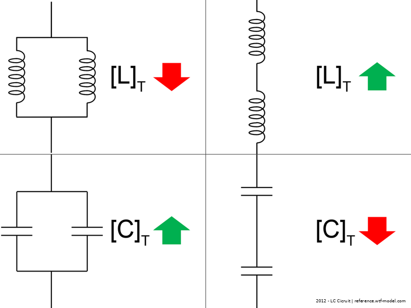 C stands for Capacitance regarding Capacitors, L for Inductance regarding Inductance. Both increase and decrease dependent on either serial or parallel circuitry.