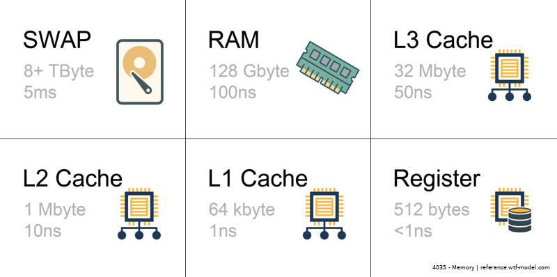 Computer memory ranges from lightning-fast registers inside the CPU to slower storage like HDDs. Cache (L1, L2, L3) sits in between, balancing speed and size.